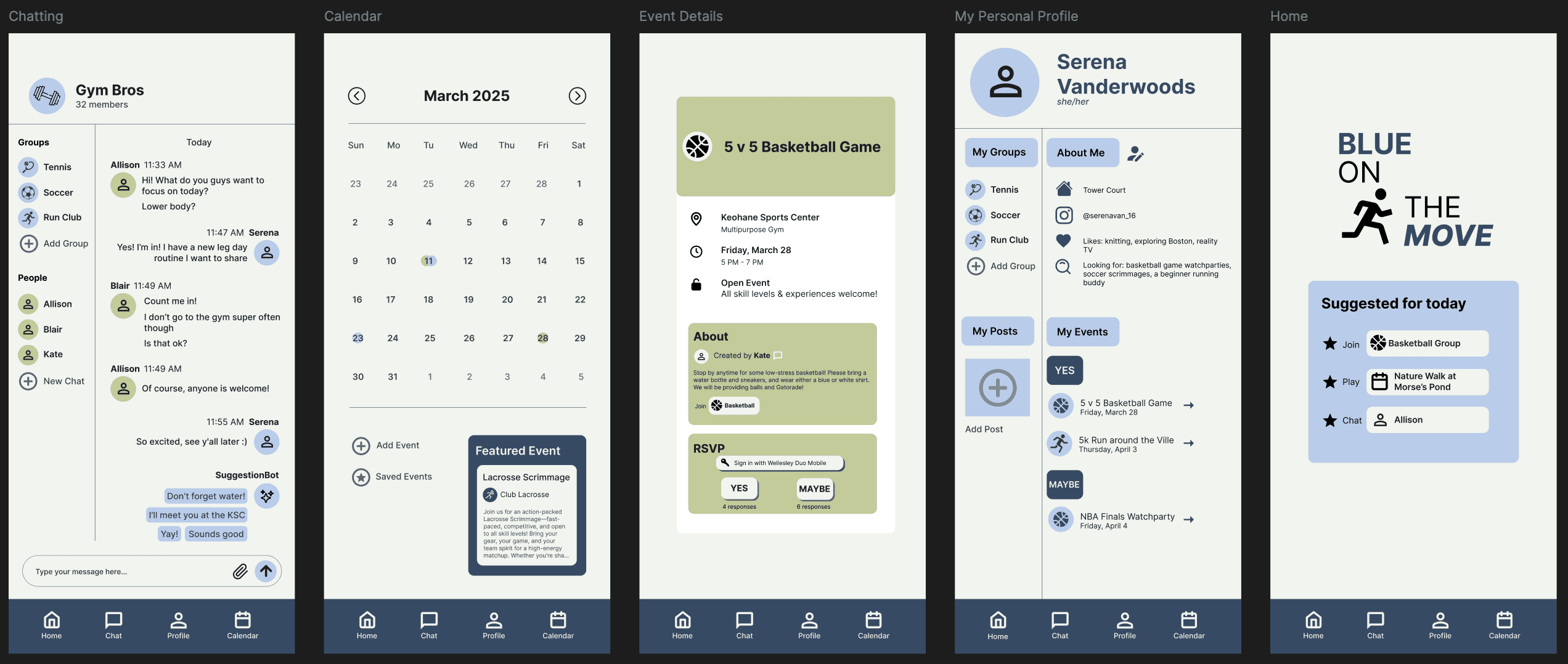 A low-pressure social and activity app designed to promote student well-being and physical activity at Wellesley that enables users to connect with like-minded peers through interest-based groups, messaging, events, and a shared calendar, all within one platform.