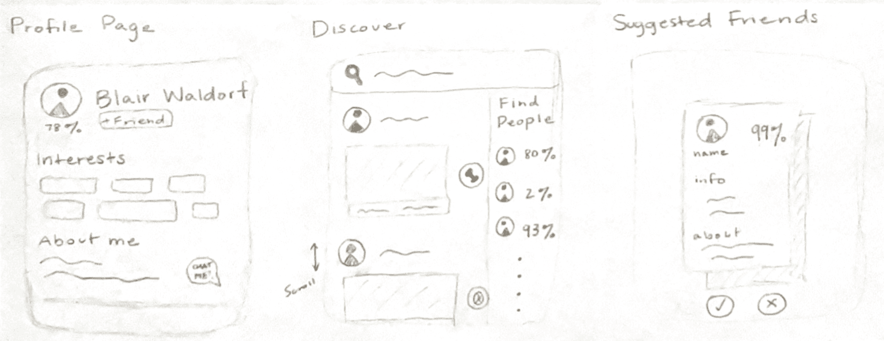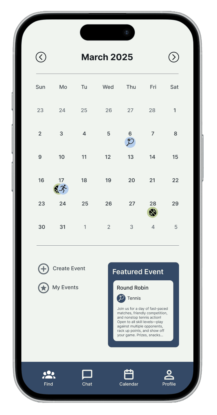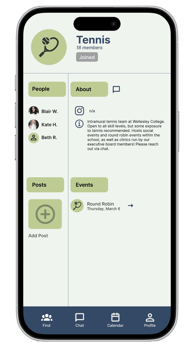 We began prototyping knowing that we wanted students to be able to join interest-based activity communities, have profiles, and a shared calendar to help users find like-minded peers and organize recreational activities.